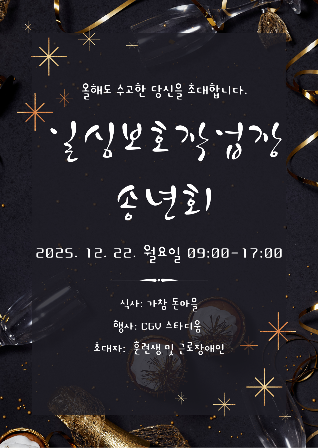 [일심보호작업장 송년회 안내] 안녕하세요. 일심보호작업장입니다. 한 해를 잘 마무리하며 동료들과 즐거운 시간을 나누고자 송년회를 마련하였습니다. 오는 12월 22일(월) 일심보호작업장 송년회가 진행될 예정입니다.근로장애인 및 모든 훈련생분들께서는 오전 9시까지 출근해 주시기 바라며, 퇴근 시간은 오후 5시 예정입니다. 일정으로는 식사를 하고, 영화관 대관하여 행사를 진행할 예정입니다. (준비물: 개인복지카드-영화관람 시 사용) 부득이한 사정으로 참석이 어려우신 분들께서는 사전에 꼭 말씀해 주시기 바랍니다. 올 한 해도 저희와 함께해 주셔서 진심으로 감사드립니다.날씨가 많이 쌀쌀해진 만큼 건강에 유의하시고, 마음만큼은 따뜻한 연말 보내시길 바랍니다. 감사합니다. 일심보호작업장 드림 |